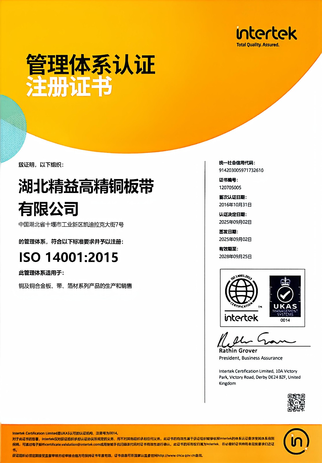 14001环境体系证书2023-2025